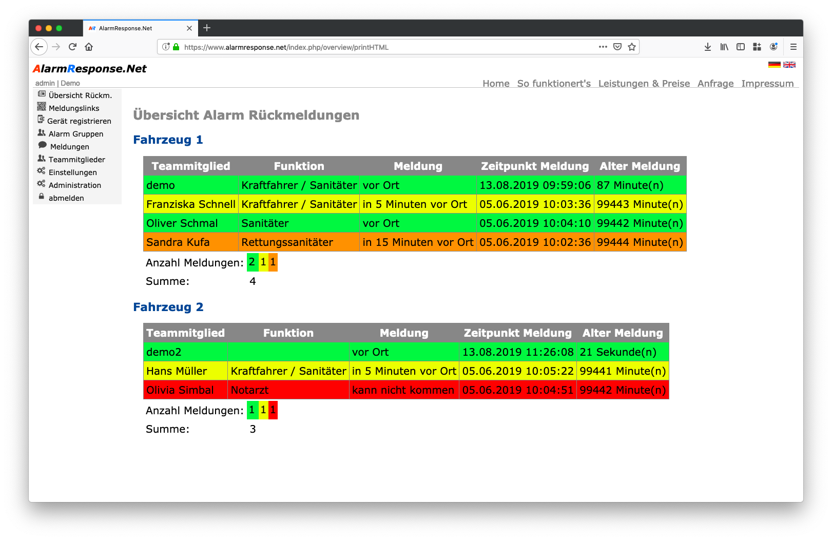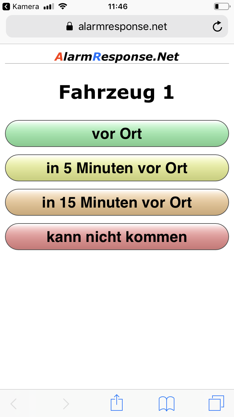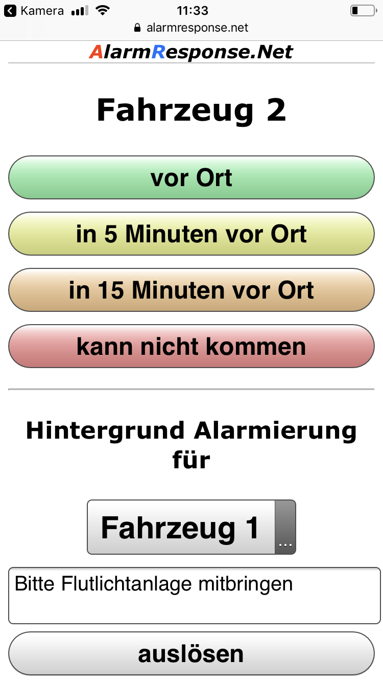 Zusätzlich zu den Schaltflächen für die Rückmeldung der eigenen Ankunft ist hier die Funktion für die Hintergrund Alarmierung zu sehen.Es können beliebig viele sogenannten Alarmgruppen (z.B. Fahrzeuge) ausgewählt werden und das System sendet dann zu den jeweils zugehörigen Personen eine SMS.